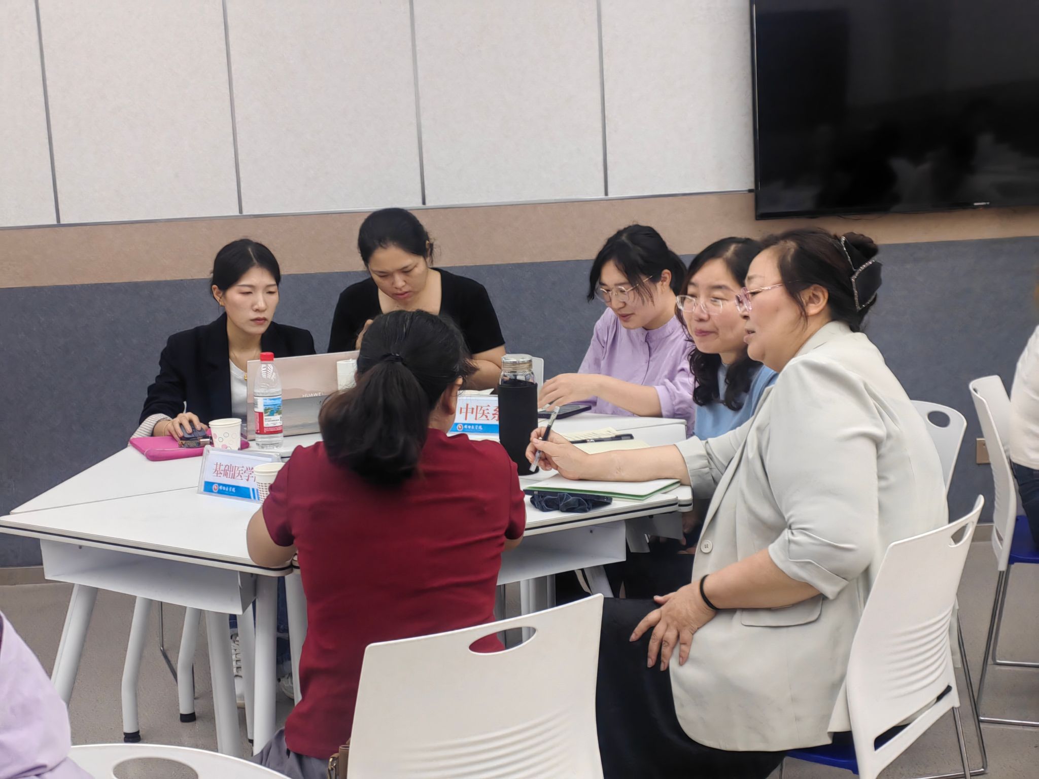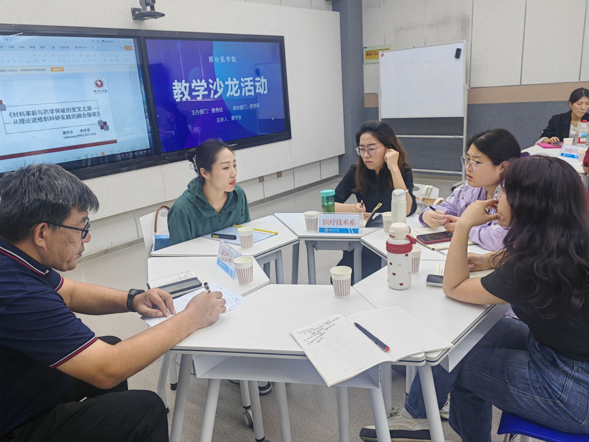 活动中,药学系教师黄宇含聚焦临床肿瘤靶向治疗科研方向,从材料选择、实验设计、成果基础和肿瘤治疗等方面进行分享,详细阐述了教学和科研相互贯通的重要性,主要有两方面做法:在教学内容设计上,将前沿知识融入课堂,推动科研反哺教学,以创新思维提升教学效果;在教师能力提升上,建设科研带动教学创新项目,积极探索新的教学模式和方法,不断提升授课质量和教学效果。与会教师热烈讨论,一致认为本次活动主题鲜明、内容丰富,为教学与科研的融合提供了新思路。