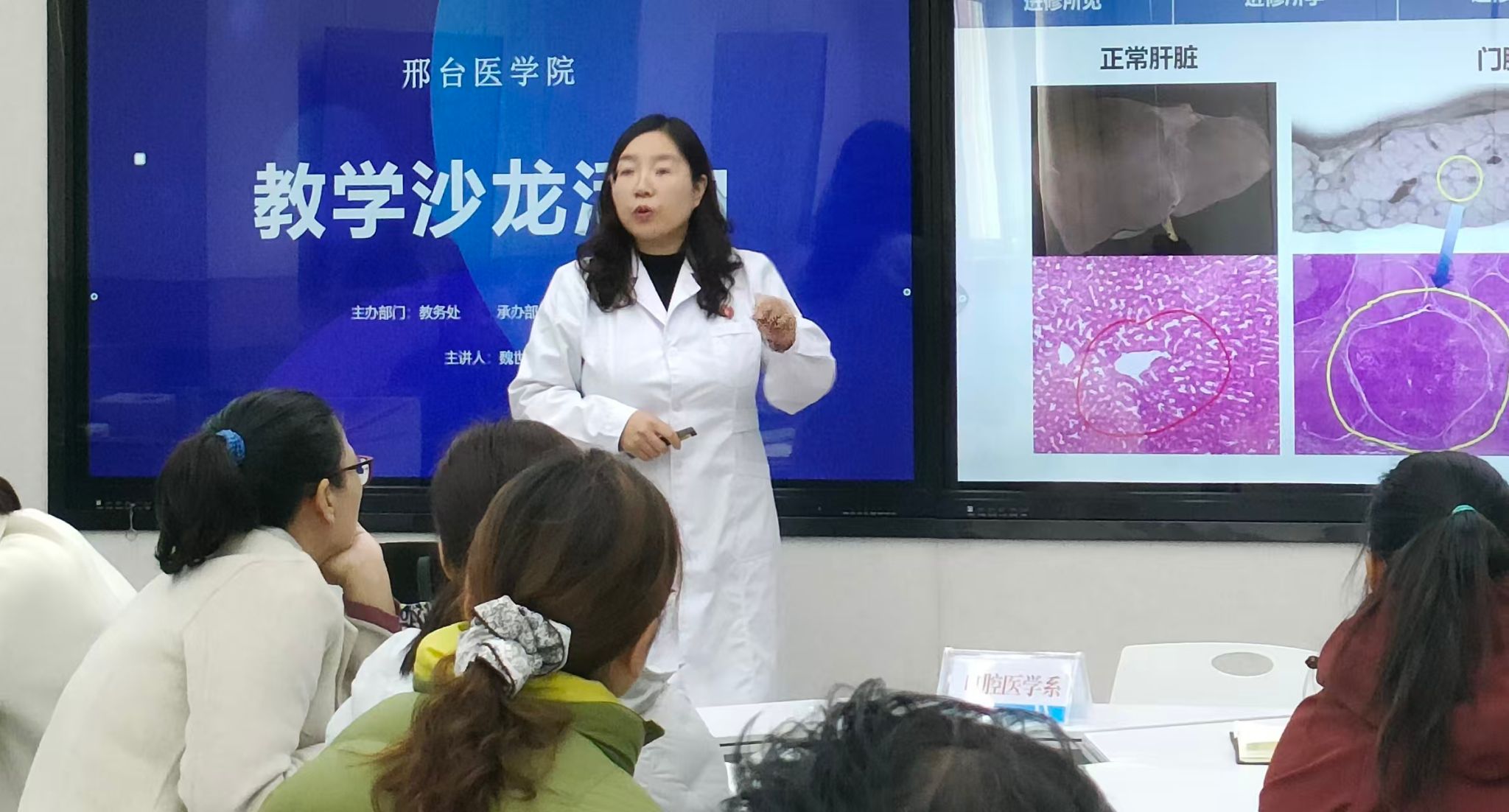 活动中,基础医学部病理教研室魏世平老师以《知不足而奋进 明方向而笃行》为题汇报其在河北医科大学的进修收获,报告结合鲜活的教学案例,与参会教师分享了河北医科大学在教学方法创新、教学手段优化及课程逻辑架构等方面的先进经验。尤为值得关注的是,魏世平老师将所学先进理念与自身教学实践深度融合,重点分享了基于PBL教学模式的探索成果——在2024级医学影像技术本科班创新构建的“临床依托+问题引导+互动教学+板书总结”特色教学模式。该模式紧扣本科教学特点,兼顾知识系统性与学生参与度,为在场教师提供了可复制的教学范例。